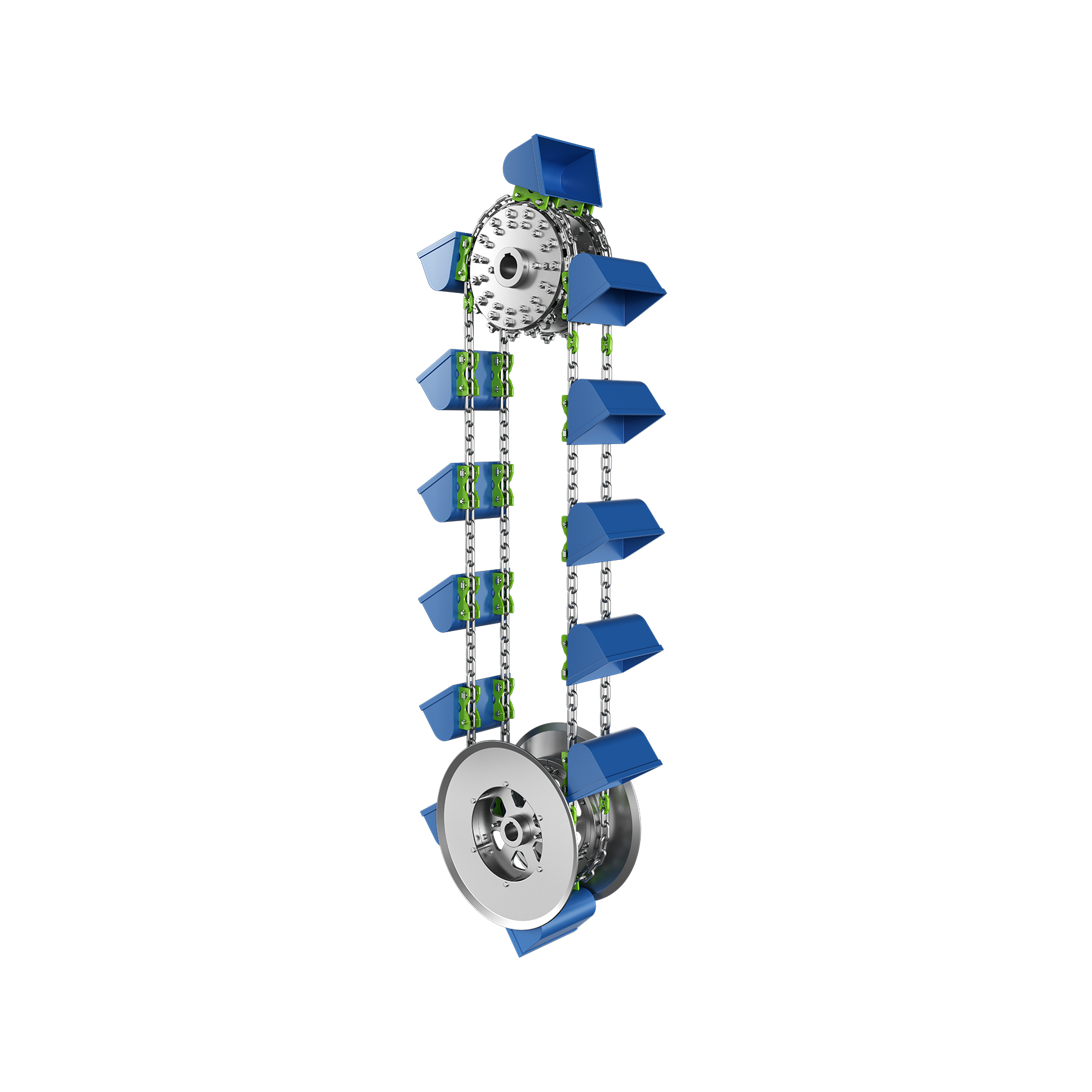 RUD bucket elevator systems offer a range of proven, high-capacity, and flexible solutions for vertical handling applications. Our hardened steel chain systems safely support large-capacity conveying, providing maximum throughput. Even challenging materials such as high-temperature or abrasive goods are compatible. Regardless of the vertical application, RUD bucket elevator systems are up to the challenge.