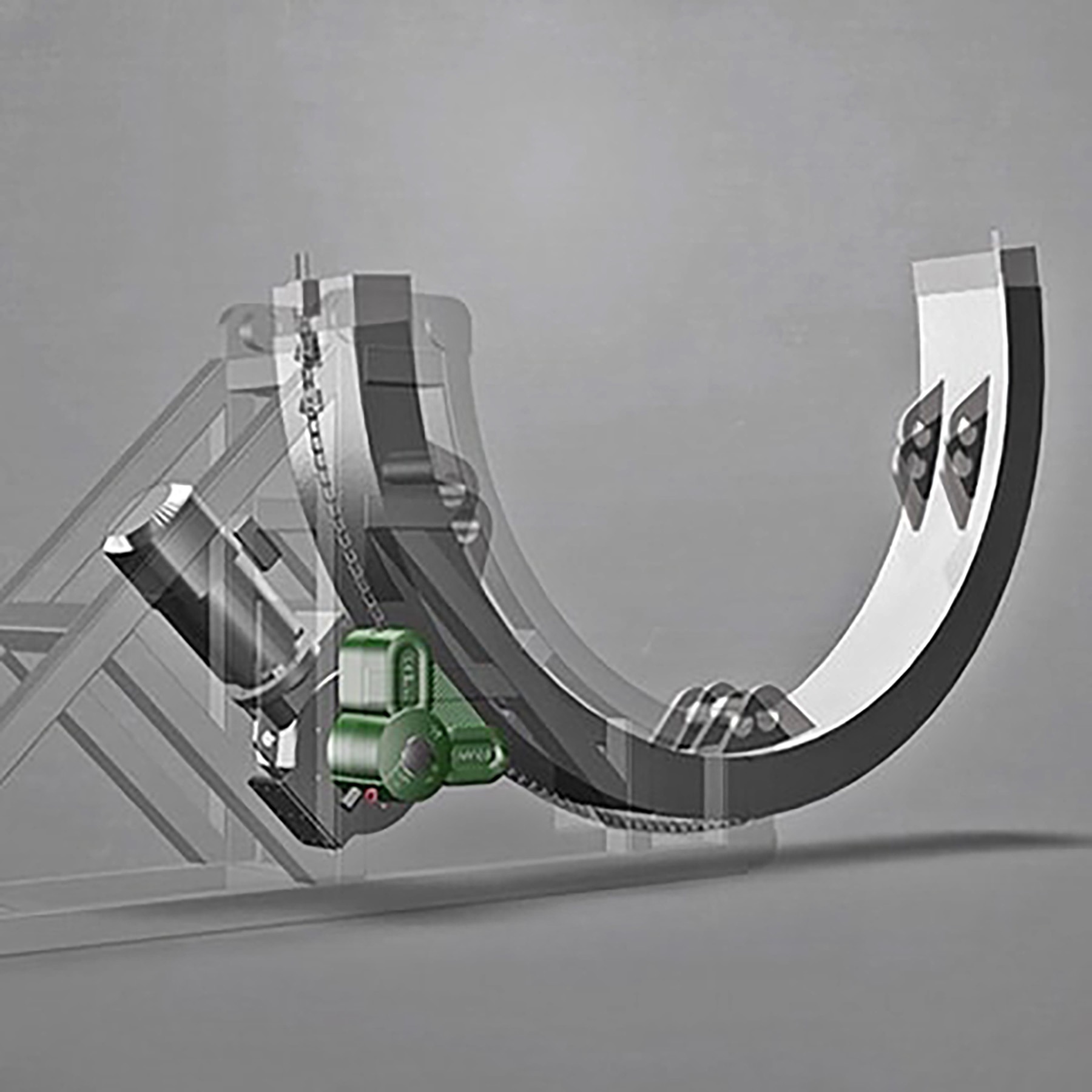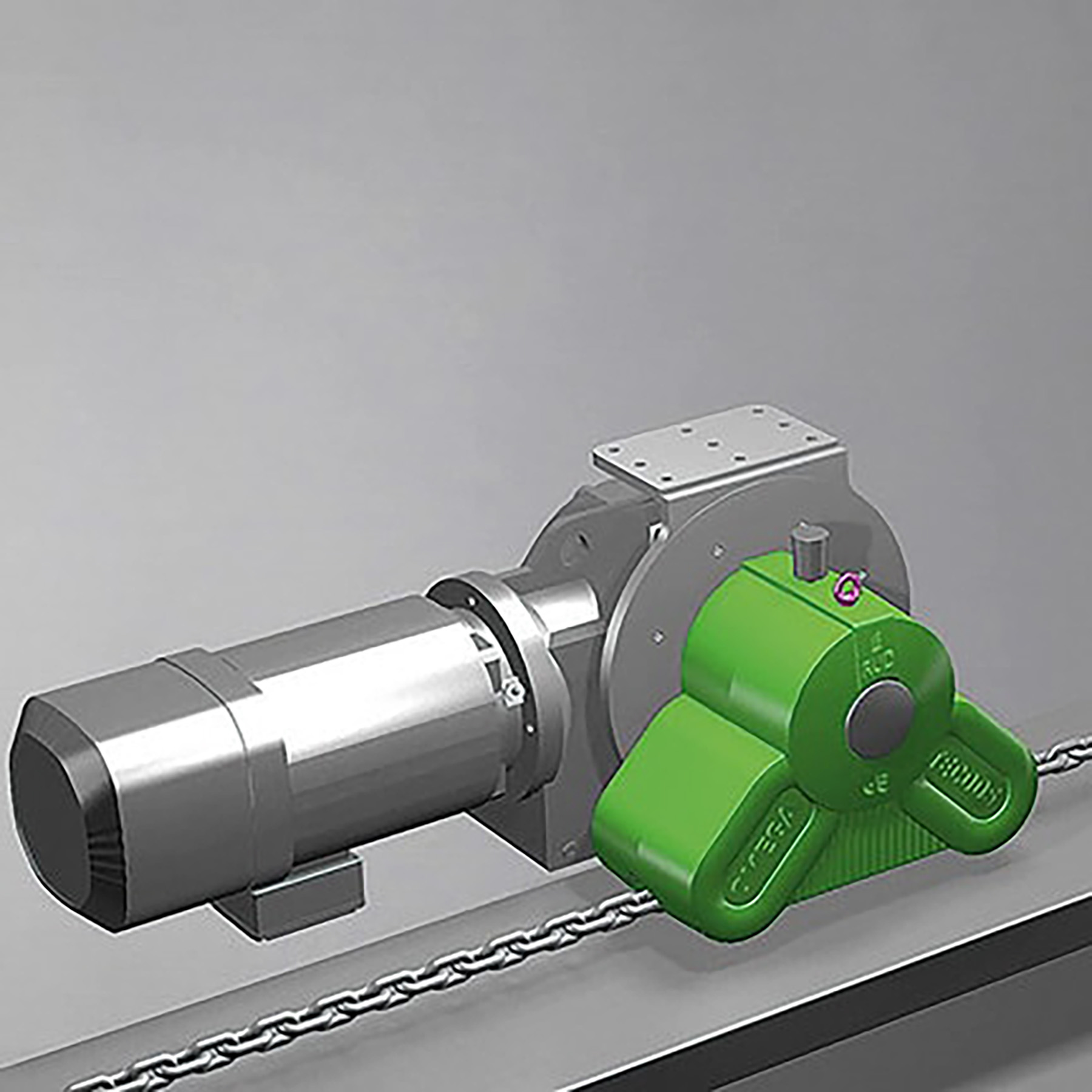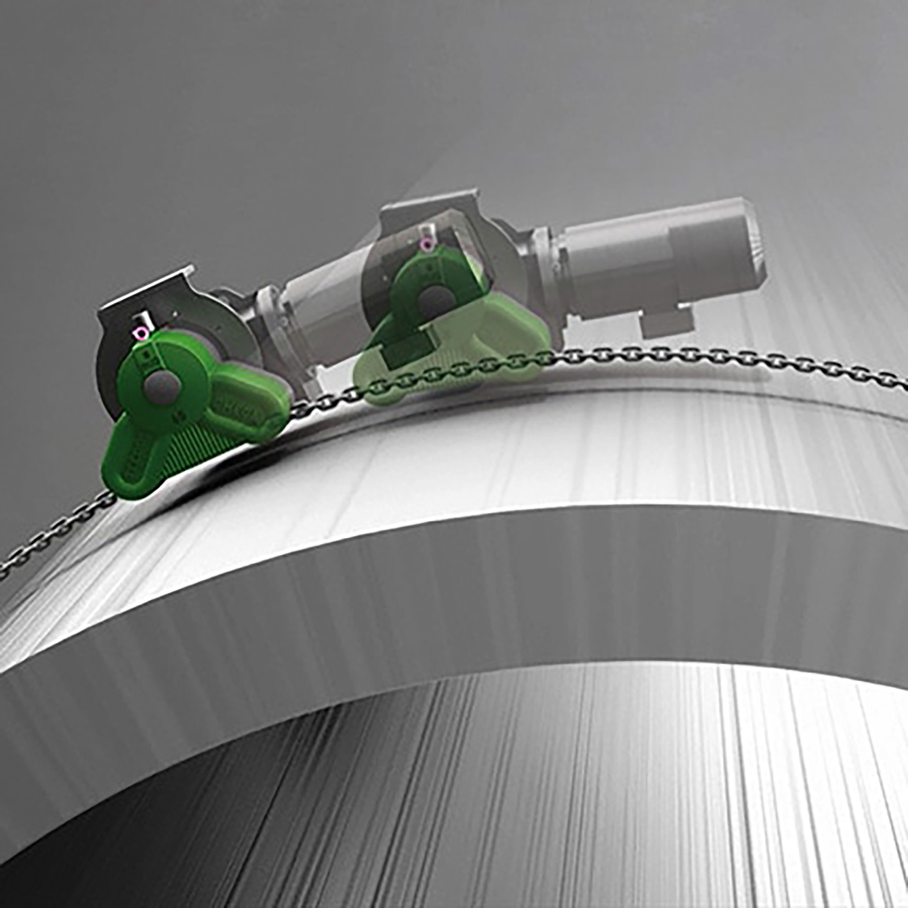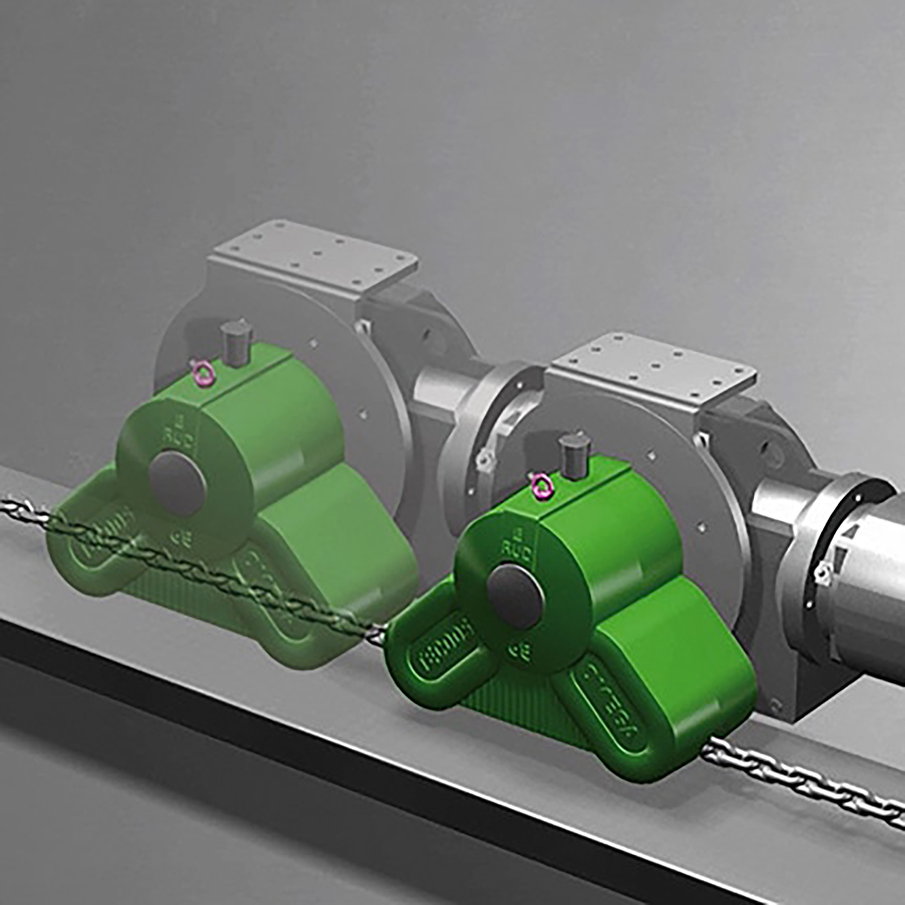 Depending on the task, the OMEGA DRIVE is attached to the load to be moved. The drive pulls along the round steel chain. Unlike standard chain drives, this system is not affected by movements in the surface underneath or on the load itself because the round steel chain compensates for these types of discrepancies.
