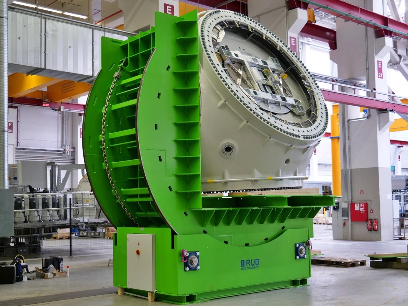 At its new Mechatronics Competence Centre in Aurich, Enercon relies on a compact turning table developed by RUD Ketten Rieger & Dietz GmbH, based in Aalen, Germany. The RUD Tecdos TM Tool Mover turns the rotor hubs, which weigh up to 65 tons, safely and quickly. The turning process, which had previously taken around two hours with a crane and chain, is now completed in just a few minutes. The turning table has been in use since April 2021 at the center.