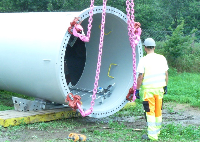 Four FLARIBOs are mounted to the top of the segment and two FLARIBOs to the bottom to erect a tower segment. The segment is then lifted using two cranes and erected in the air. The sling chains move over the deflection rollers of the RUD VIP Chain Block (VCB). The VCB allows load balancing for the segment to be positioned vertically. The flange to flange can then be bolted together. When the four FLARIBOs are removed from the top of the tower segment, the deflection rollers of the VCB prevent the unloaded side of the chain from slipping through and falling.