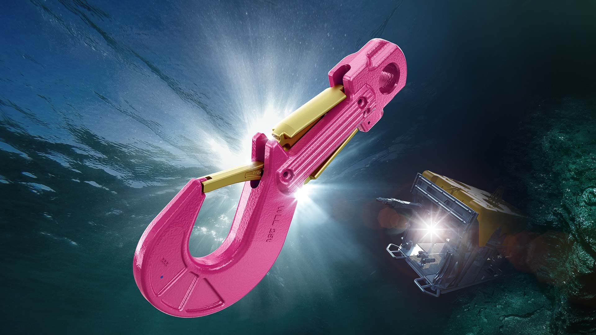 The RUD ROV-HOOK is engineered for optimal grip and is compatible with all standard ROV manipulators, including the 'grabber'. This minimises the time required for subsea attachment and detachment. It operates without restriction at depths of several thousand metres and is available in two versions with a maximum Working Load Limit (WLL) of 10 or 25 tonnes.